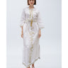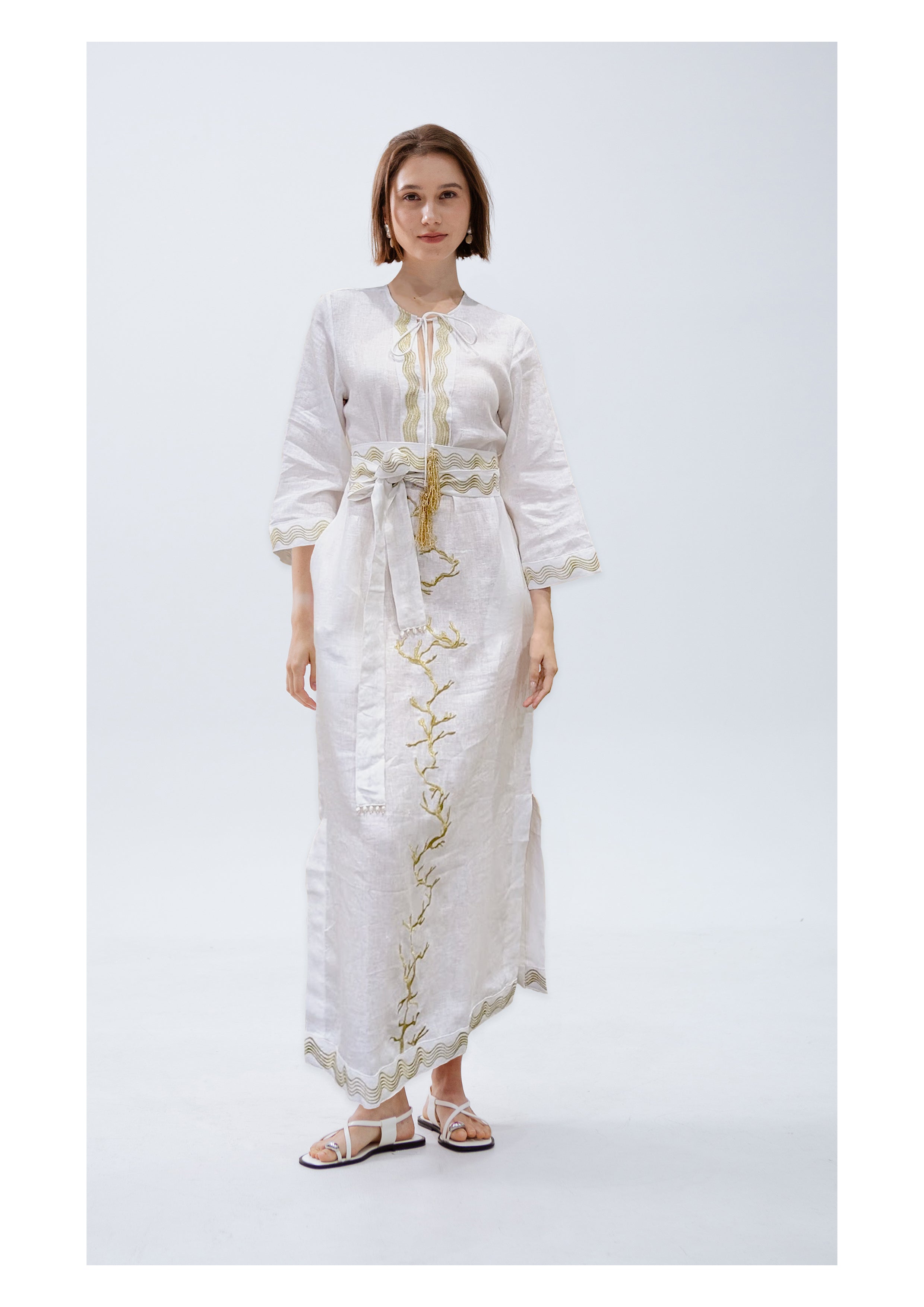 The Venus Kaftan re-imagines the traditional mid-century kaftan for a modern, elevated look. The dress is composed of 100% European Linen, with custom coral and wave embroidery to the cuffs, neckline and hem, and front and back panels. Included is a beautifully embroidered belt that is able to be double-wrapped and features real natural baroque pearl trim.